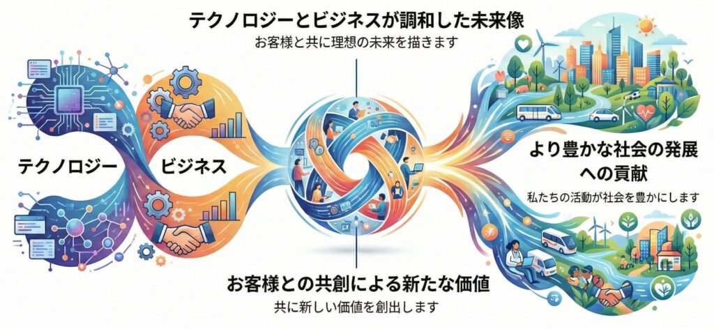 VUCA, SDGs, ESG, DXなどのメガトレンドへの対応が求められる現代社会に対し、テクノロジーとビジネスの調和した未来像を描き、お客様とともに新たな価値を共創し、最適なソリューションを提供します
