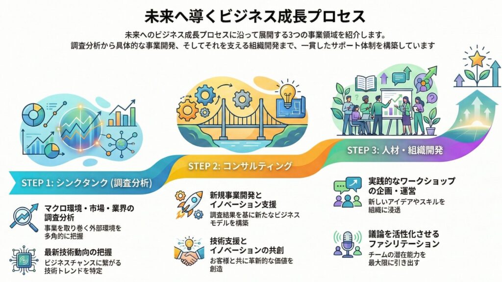 未来へのビジネス成長のプロセスに沿った3つの領域で事業を展開しています