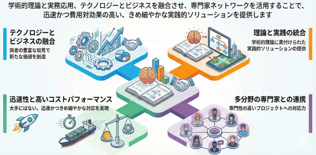 - 学術機関を中心とした理論研究と、技術系上場企業での実務応用の両者の知識・経験を有しており、勘だけに頼らない理論的な裏づけを踏まえた実践的なソリューションを提供することができます。